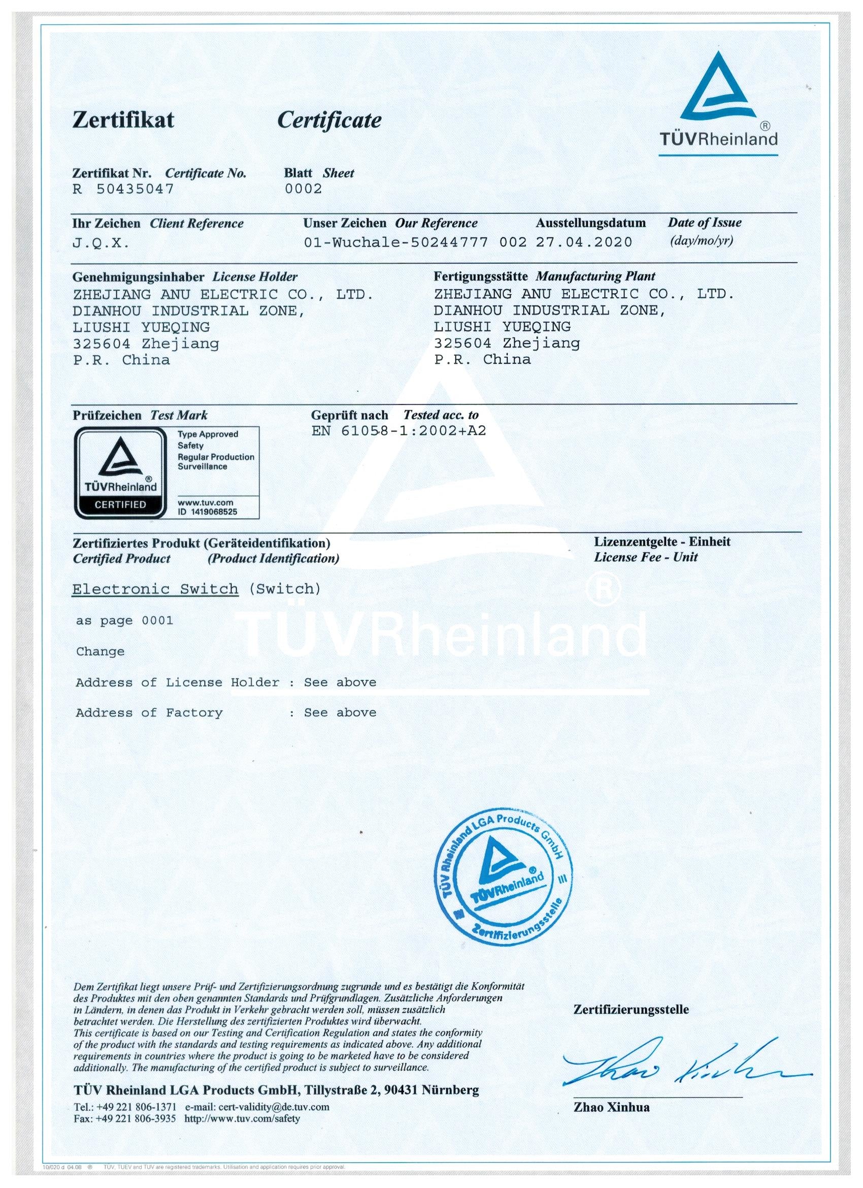 TUV Certification for Electronic Switch
